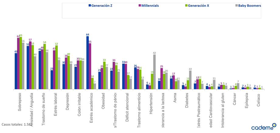 Cuarto quedó el trastorno del sueño, que afectó en su mayoría a los X (54%), en un 48% a los millennials, un 46% a los Z y un 44% a los boomers.