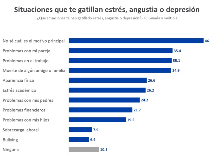 Ante la consulta ¿qué situaciones te han gatillado estrés, angustia o depresión? Un 46% dijo no saber cuál es el motivo principal, un 35.4% lo aludió a problemas con su pareja y 35.1% a problemas en el trabajo.