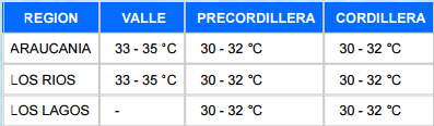 Según se indica en el boletín, para este viernes 7 de diciembre en La Araucanía, Los Ríos y Los Lagos los termómetros marcarán temperaturas que superarán los umbrales extremos de calor, las que oscilarán entre los 30 y 35 grados en algunos sectores.
