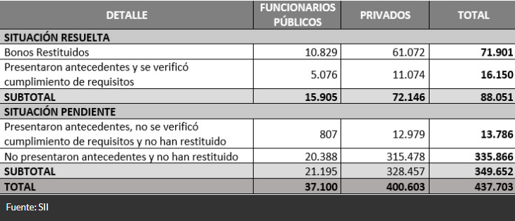 De esta forma, quienes mantienen situaciones pendientes son 349.652 personas, quienes deberán restituir los montos recibidos con la aplicación de reajustes, intereses y multas que correspondan.
