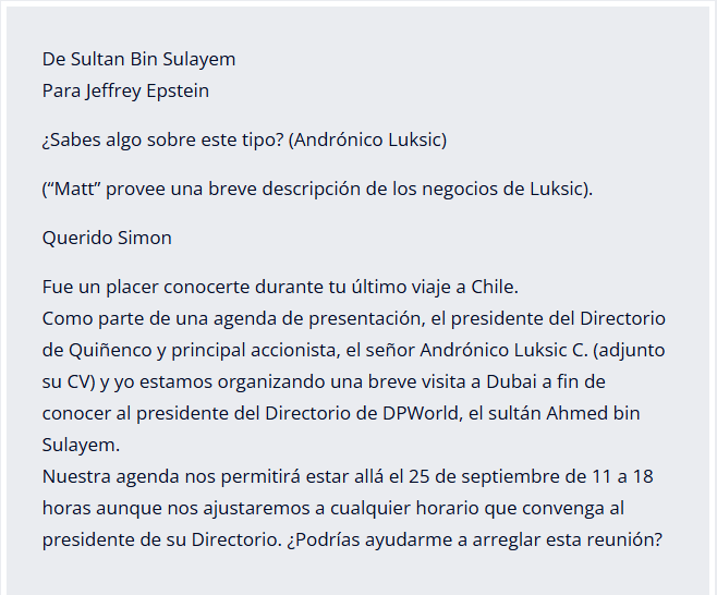 Sobre el caso de Luksic, es mencionado en una comunicación sostenida entre el fallecido magnate financiero y el empresario emiratí Sultan Bin Sulayem.