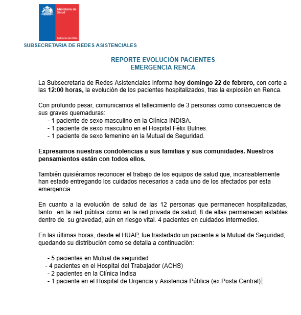 Este domingo 22 de febrero, con corte a las 12:00 horas, la Subsecretaría de Redes Asistenciales actualizó el estado de los pacientes hospitalizados y confirmó una lamentable noticia: tres personas fallecieron producto de la gravedad de sus quemaduras.