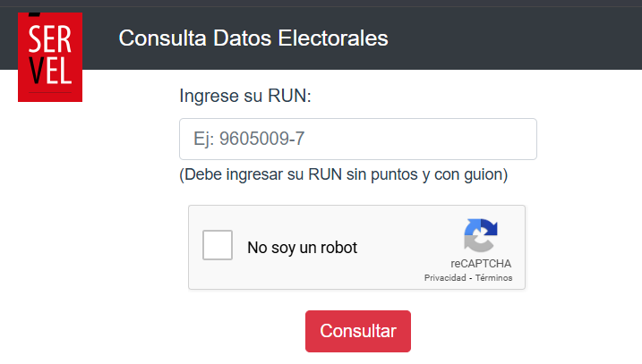 Primero el consultante debe ingresar en este enlace del Servicio Electoral de Chile (Servel), ingresar su RUT (sin puntos y con guion) y marcar la casilla “No soy un robot”.