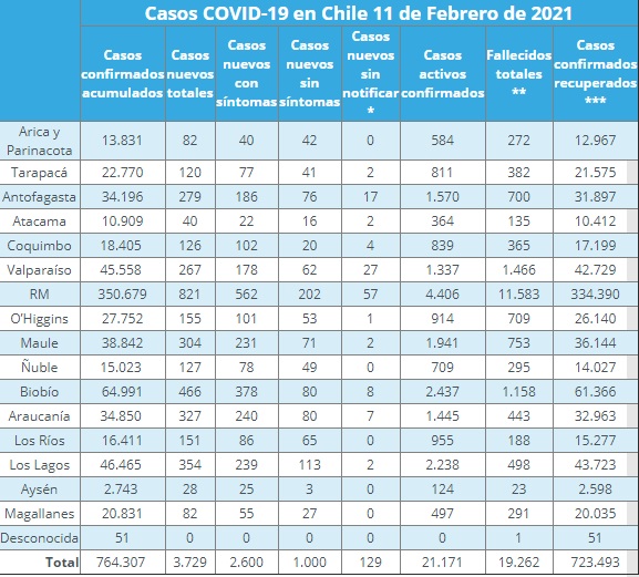 En esta instancia, el Subsecretario de Redes Asistenciales, Alberto Dougnac, informó 3.729 casos nuevos, de los cuales 2.600 son sintomáticos, 1.000 asintomáticos y 129 no fueron notificados. De ese modo, el número de contagios totales asciende a 764.307, donde 21.171 siguen activos.