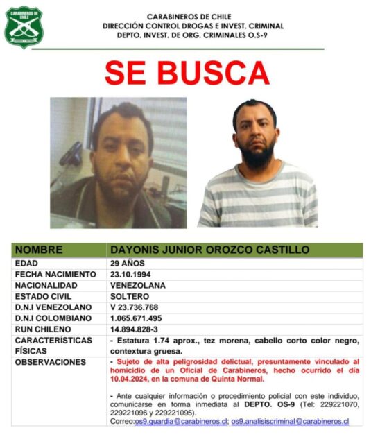 En cuanto al prófugo, se trata de Dayonis Junior Orozco Castillo de 29 años. Según publicó Carabineros, el sujeto tiene cabello corto y color negro, es de contextura gruesa y de tez morena.