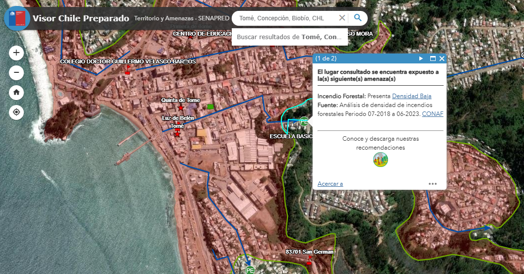 Para facilitar la evacuación, Senapred puso a disposición de la ciudadanía el Visor Chile Preparado, una plataforma digital que permite identificar, en tiempo real y de manera georreferenciada, si una dirección específica se encuentra en una zona segura o con riesgo de inundación.