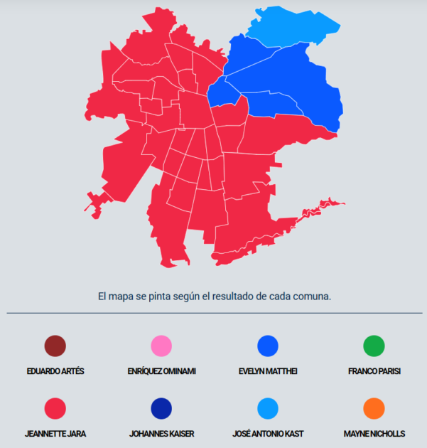 La candidata comunista se impuso en 32 comunas, mientras que Evelyn Matthei en 4 comunas, y Johannes Kaiser solo triunfó en una.