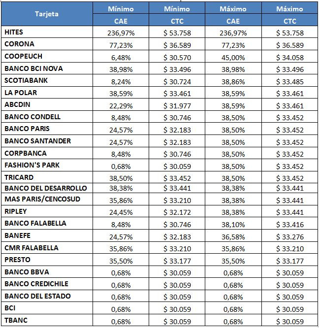 A continuación puedes ver el listado completo de cuánto cuesta adquirir con cada tarjeta de crédito un producto de $30.000, en 3 cuotas con el mínimo y máximo CAE. Cabe añadir que, como ya indicamos, el CTC es el costo total a cancelar por el cliente: