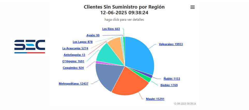 Hasta el momento, la región más impactada es Valparaíso, donde cerca de 20 mil hogares permanecen sin suministro eléctrico. Le sigue la región del Maule, con 15.291 mil clientes afectados por cortes de luz.