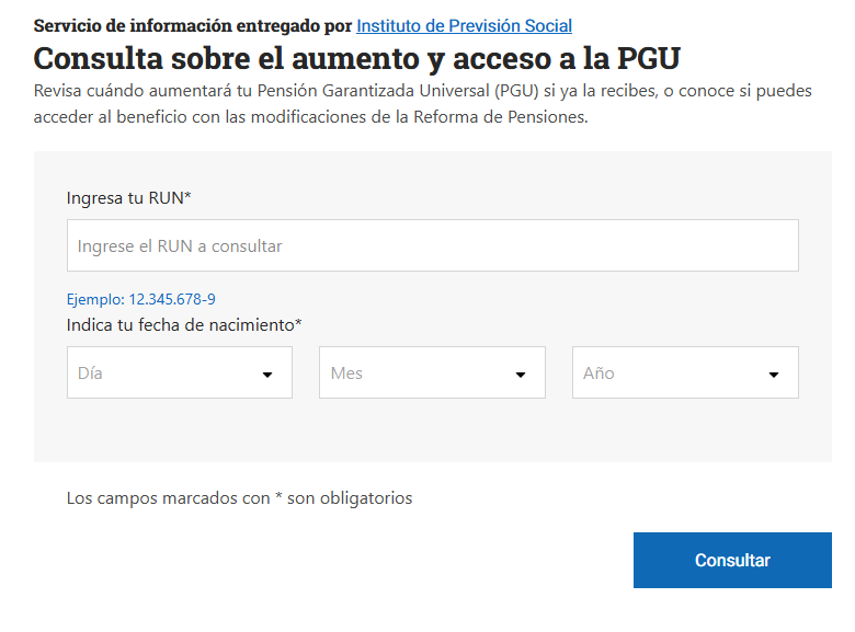 Para saber cuándo aumentará tu PGU, si ya la recibes, ingresa tu RUN y fecha de nacimiento en el sistema. También podrás verificar si con las nuevas modificaciones puedes acceder al beneficio.