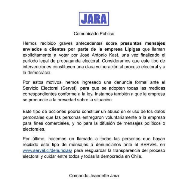 El contenido generó fuerte rechazo en redes sociales, y la propia Jeannette Jara usó esta plataforma para compartir un comunicado oficial de su comando, advirtiendo que hicieron la denuncia pertinente ante el Servel.