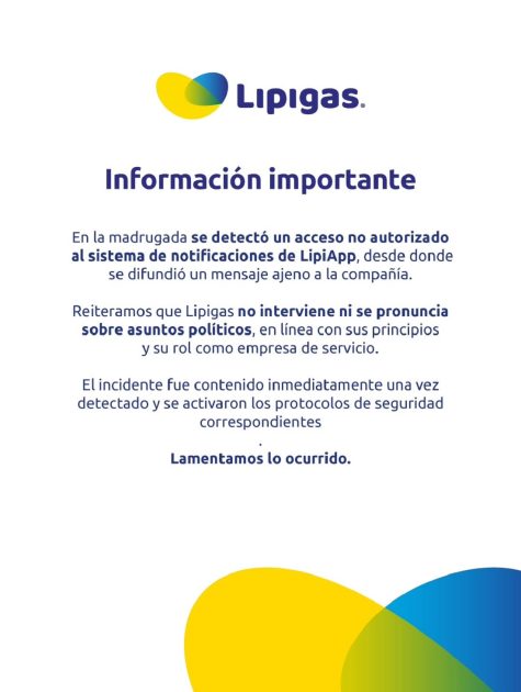“En la madrugada se detectó un acceso no autorizado al sistema de notificaciones de LipiApp, desde donde se difundió un mensaje ajeno a la compañía”, dijeron.
