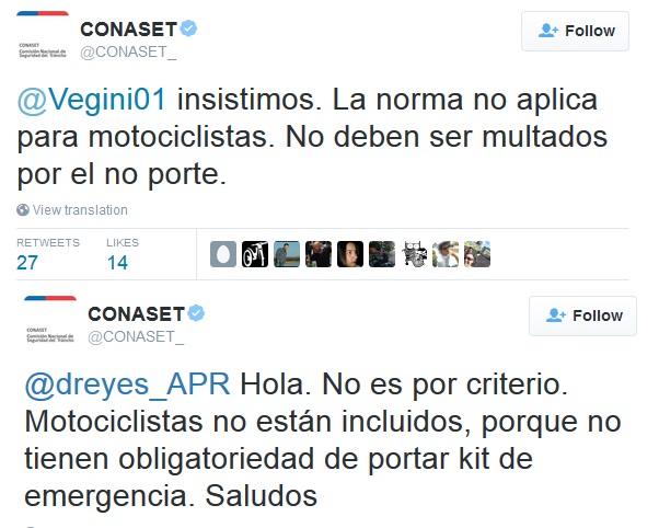 Además, la Comisión Nacional de Seguridad de Tránsito, señaló por medio de Twitter en reiteradas ocasiones que no se puede multar a los motociclistas, porque la norma no los incluye.