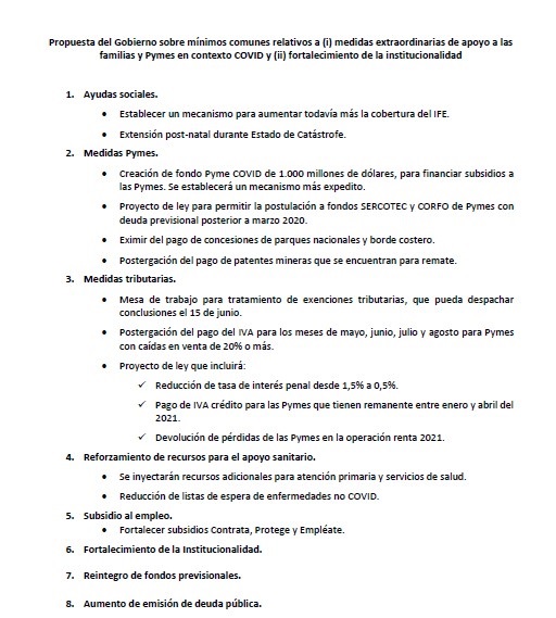 En este contexto, el Gobierno entregó una propuesta preliminar que consta de 8 puntos, entre los que destacan ayudas sociales, medidas pymes y tributarias, subsidio al empleo, entre otros.