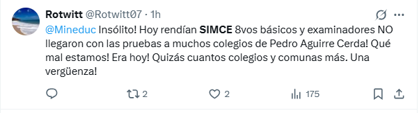 Misma opinión expresó el alcalde de Paine, Rodrigo Contreras, quien en X indicó que fue “una falta total de prolijidad del Mineduc. Ayer no hubo visitas inspectivas y hoy no llegaron los examinadores a al menos 10 colegios. Grave y lamentable”.