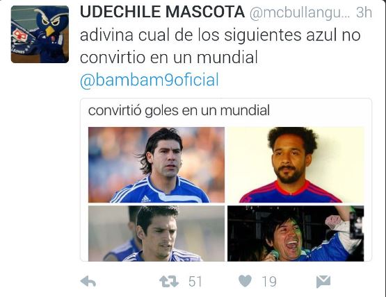 Fue un hincha de la Universidad de Chile el que trató de burlarse del ex ‘Pichichi’ de la liga española con una imagen donde se ve a Zamorano usando la camiseta azul y también las fotos de Marcelo Salas, Jean Beausejour y Mark González, todas acompañadas de una insidiosa pregunta: ¿Adivina cuál de los siguientes jugadores no marcó en un mundial?