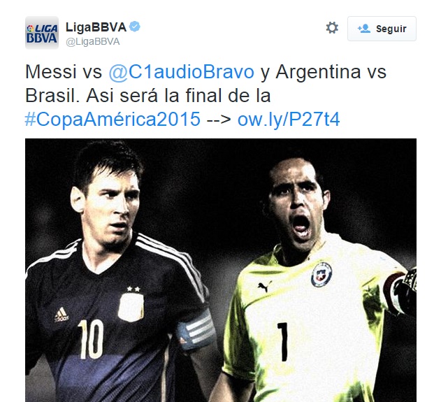 “Messi vs @C1audioBravo y Argentina vs Brasil. Asi será la final de la #CopaAmérica2015” (sic), fue el mensaje que incluye el grosero error.