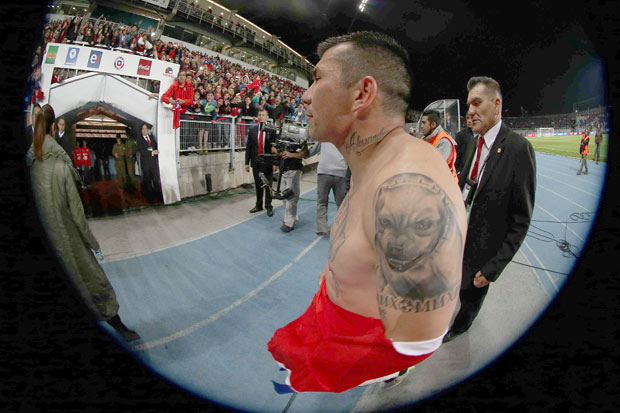 Precisamente en el partido disputado en el Estadio El Teniente de Rancagua se pudo ver el nuevo tatuaje que el todo terreno exhibe en su cuello.