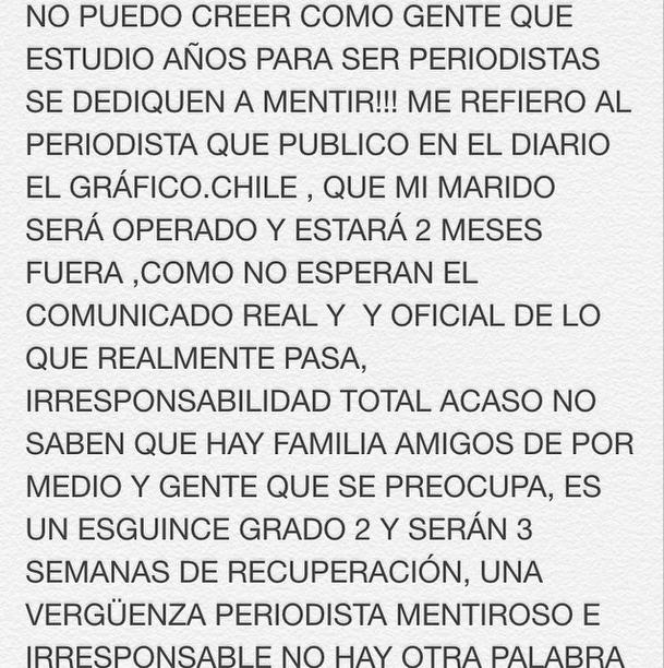 A raíz de lo anterior, y aburrida de que algunos periodistas mal informen a la población, la rubia le dedicó un ácido mensaje al profesional que preocupó de manera gratuita a los familiares y amigos del futbolista, puesto que sólo se trata de un esguince grado 2 que demandará tres semanas de recuperación.