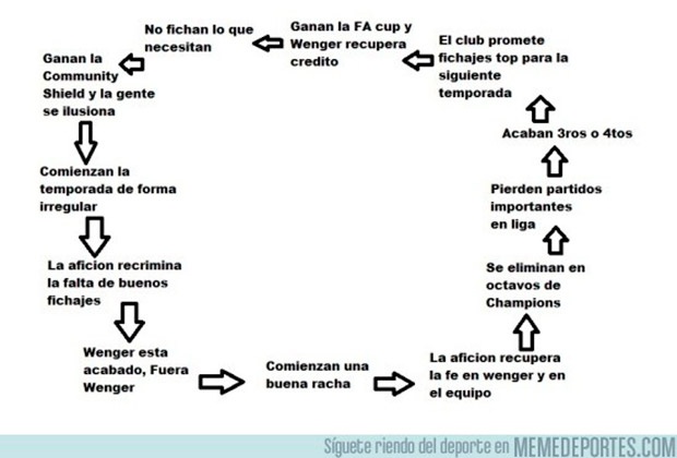 Como la irregularidad de Arsenal es una constante, un ingenioso amante del fútbol realizó un detallado meme que enlaza ideas y que grafica de manera perfecta el actuar deportivo del conjunto “gunner” durante las últimas temporadas.