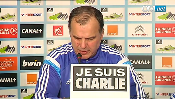 De igual forma, durante toda su estadía en la sala de prensa, frente a su micrófono, Bielsa exhibió un cartel con la inscripción “Je suis Charlie” (“Yo soy Charlie”). Al margen de lo netamente deportivo, el DT también tuvo palabras para referirse a esta nefasta matanza, señalando de manera tajante que “no hay hechos que justifiquen la muerte. Es terrible”.