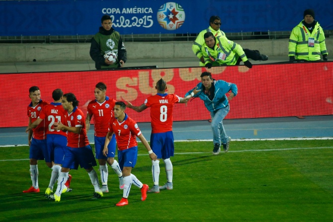 Precisamente fue durante el festejo del gol conseguido desde el punto de sentencia, cuando un hincha burló el perímetro de seguridad e ingresó al terreno de juego como un jugador más a celebrar con Arturo.