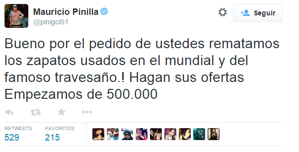 Sin embargo, no se trata de cualquier par de zapatos, sino que corresponden a los que utilizó Pinilla para el histórico partido en el mundial de Brasil de este año, recordado por el fallido tiro al arco.