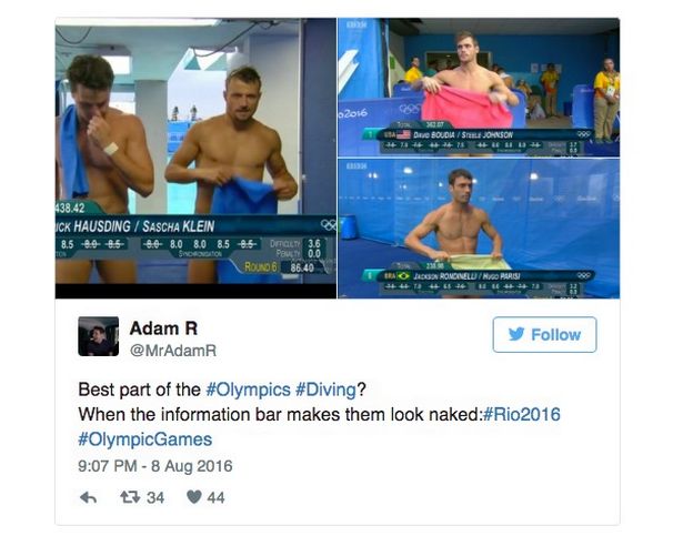 The best part of men's synchro diving – when they look naked thanks to the score bar placement #Rio2016 #diving 😛😍 pic.twitter.com/5vNRg82QL0