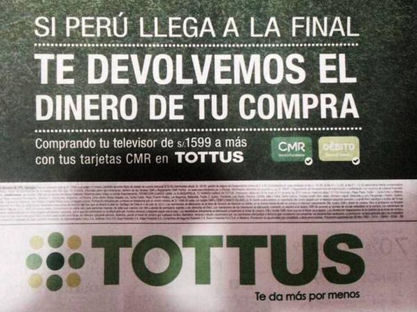 “Sí Perú llega a la final te devolvemos el dinero de tu compra” fue la oferta que llevó a cientos de peruanos a comprar en la cadena internacional Tottus, que prometió reembolsar lo que sus clientes hayan gastado en televisores adquiridos entre el 29 de mayo y el 10 de junio, informó el medio internacional BBC.