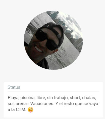 “Playa, piscina, libre, sin trabajo, short, chalas, sol, arena= Vacaciones. Y el resto que se vaya a la CTM” (sic), aparece en el estado justo debajo de una fotografía donde se le ve posando con el mar de fondo.