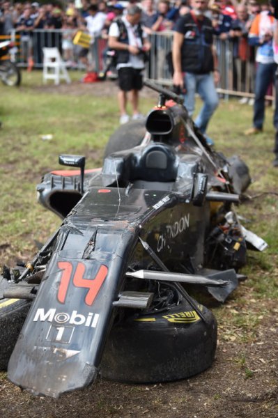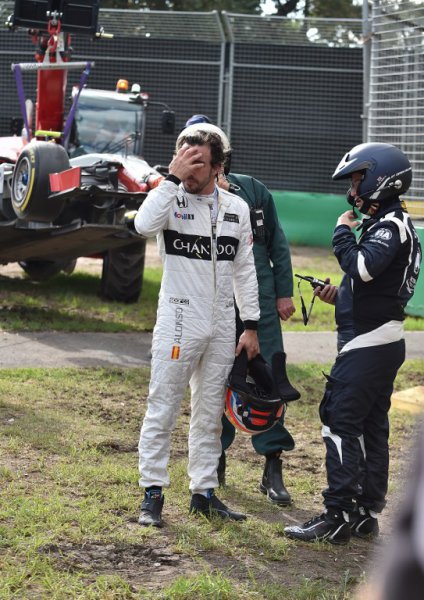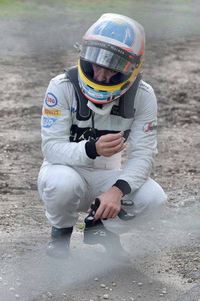 El piloto español salió ileso, salvo un poco de dolor en una rodilla, de un accidente espectacular en la vuelta 17, cuando en su intento de adelantar al mexicano Esteban Gutiérrez el monoplaza de Alonso tocó la rueda trasera del vehículo del mexicano, lo que provocó que el McLaren saliese despedido hasta impactar en dos ocasiones con los muros de seguridad.