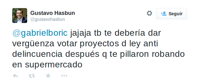 Los protagonistas de este round político son los legisladores UDI, Gustavo Hasbún, y el independiente Gabriel Boric, quienes iniciaron una aireada y vergonzosa discusión a través de Twitter sobre el tema de la votación de ‘proyectos de ley anti delincuencia’.