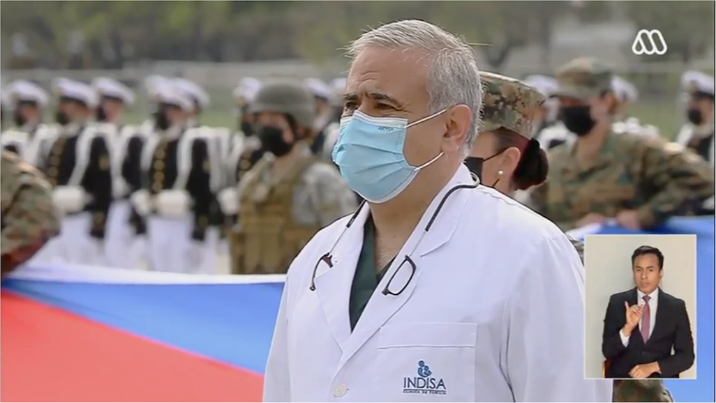 De esta manera, representantes de la sociedad civil, médicos, enfermeras, paramédicos, camilleros, administrativos, bomberos, transporte público, funcionarios municipales, Carabineros y PDI, entre otros, desfilaron junto a una gran bandera chilena, para posteriormente recibir un aplauso, guardar un minuto de silencio y cantar el himno nacional en memoria de los 37.359 fallecidos por el COVID-19.