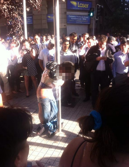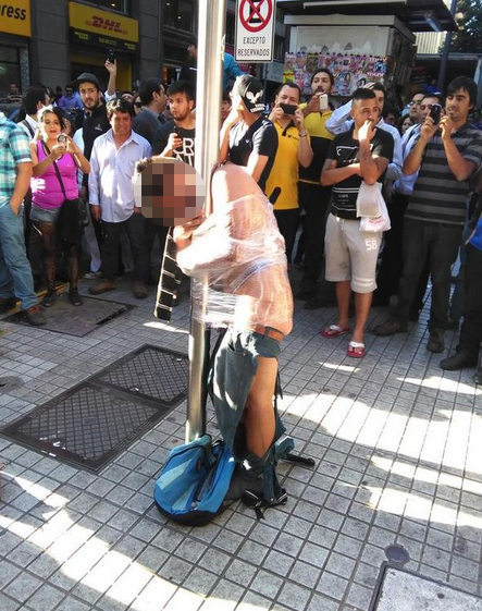 Varios transeúntes que pasaban por el lugar -en la intersección de calles Bandera con Agustinas- lo atraparon y no contentos con retenerlo hasta que llegaran los carabineros, decidieron envolverlo con plástico contra un poste, romperle la ropa y dejarlo semi desnudo en la vía pública.