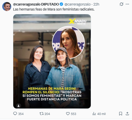 “Las hermanas feas de Mara son feministas radicales”, escribió el parlamentario, comentario que generó una serie de reacciones.