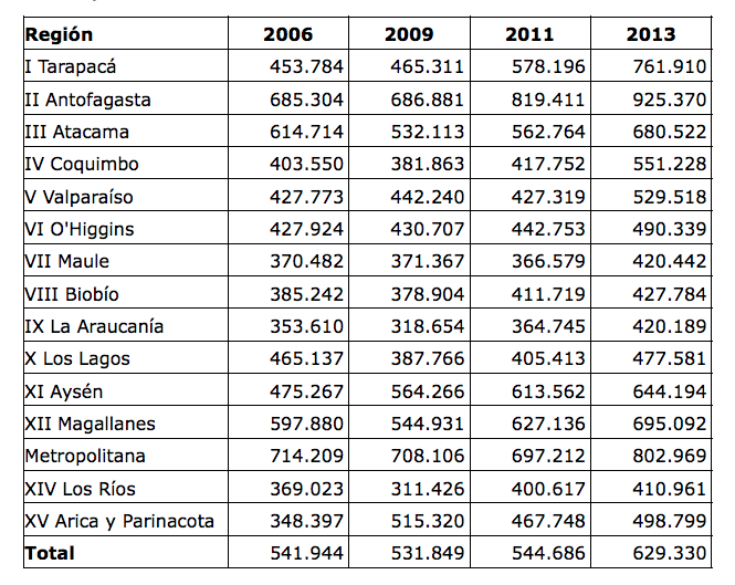 Ingreso del trabajo promedio mensual del hogar según región (2006-2013)