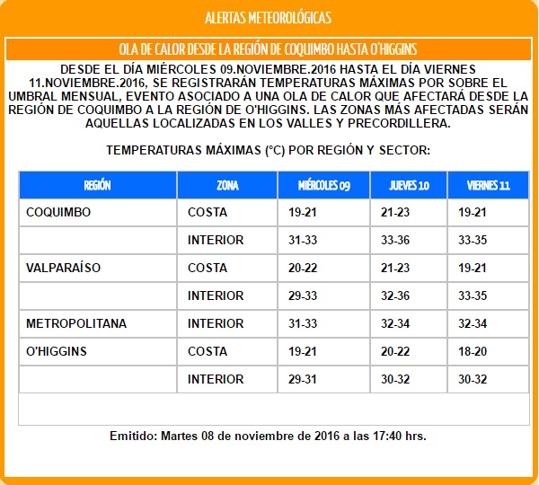 La Dirección Meteorológica de Chile anunció altas temperaturas desde el miércoles 9 hasta el 11 de noviembre en cinco regiones del país, decretándose una alerta ante dicha “ola de calor”.