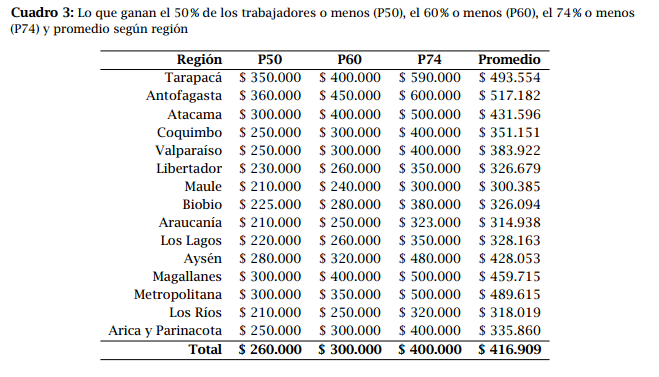 En tanto, “en nueve regiones del país se calcula una media salarial inferior al promedio nacional de $416.909. Entre ellas destacan El Maule, La Araucanía y Los Ríos con ingresos promedios inferiores a $320.000“, acota el texto.