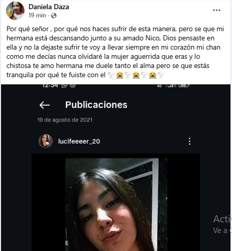 “¿Por qué, señor, por qué nos haces sufrir de esta manera? Pero sé que mi hermana está descansando junto a su amado Nico. Dios, pensaste en ella y no la dejaste sufrir. Te voy a llevar siempre en mi corazón, mi ‘chan’ como me decías”, escribió.