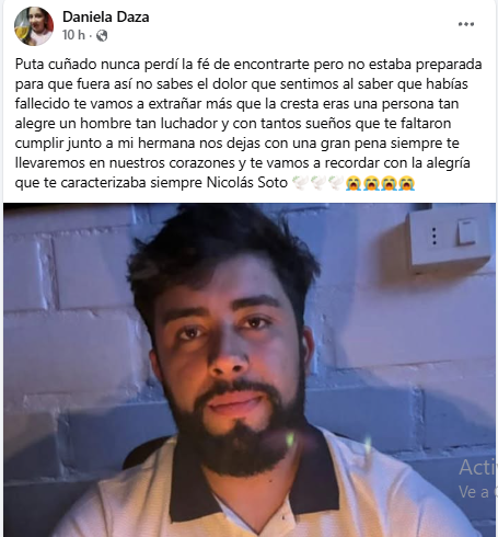 “Te vamos a extrañar más que la cresta, eras una persona tan alegre, un hombre tan luchador y con tantos sueños que te faltaron cumplir junto a mi hermana. Nos dejas con una gran pena, siempre te llevaremos en nuestros corazones y te vamos a recordar con la alegría que te caracterizaba siempre, Nicolás Soto”, agregó.