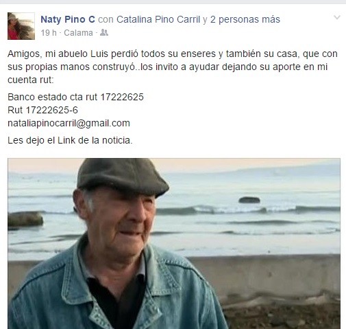 De igual forma, los nietos de don Luis Carril, entre ellas Natalia Pino Carril, inició a través de redes sociales una colecta en línea para ir en directo apoyo del esperanzado hombre.