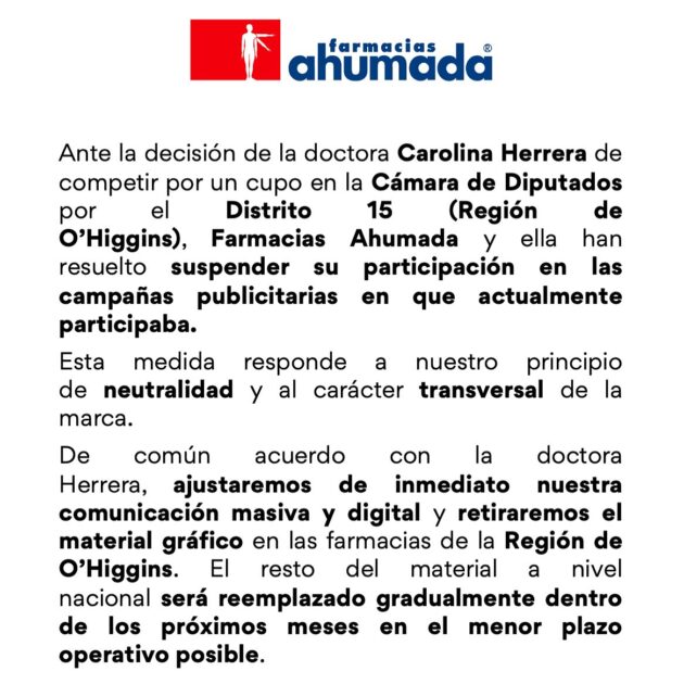 “Ante la decisión de la doctora Carolina Herrera de competir por un cupo en la Cámara de Diputados por el Distrito 15 (Región de O’Higgins), Farmacias Ahumada y ella han resuelto suspender su participación en las campañas publicitarias en que actualmente participaba”, explicaron.
