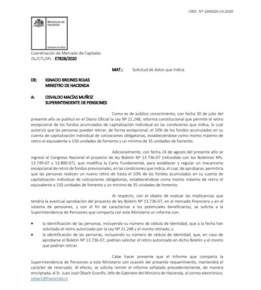 Una nueva polémica se generó en redes sociales, luego que se difundiera un oficio que detalla una solicitud del ministro de Hacienda, Ignacio Briones, a la Superintendencia de Pensiones, donde pide que se le entregue la nómina de afiliados -nombres, rut y monto- que hicieron efectivo el retiro del 10% de sus fondos AFP, a mediados de este año.