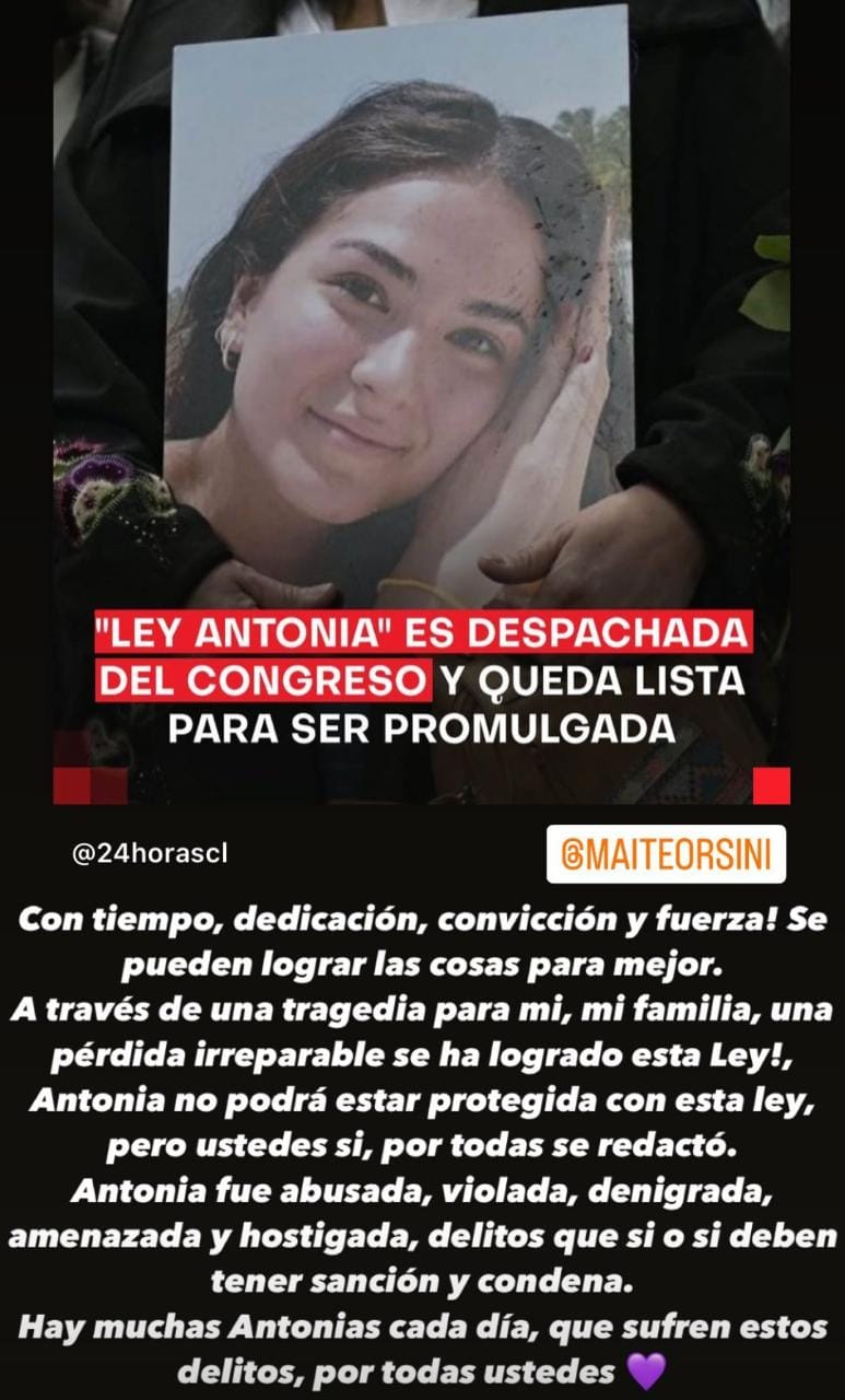 Tras darse a conocer la noticia, Carla Barra, hermana de Antonia, reaccionó al despacho de la Ley, enfatizando que nació a raíz de una pérdida irreparable para la familia.