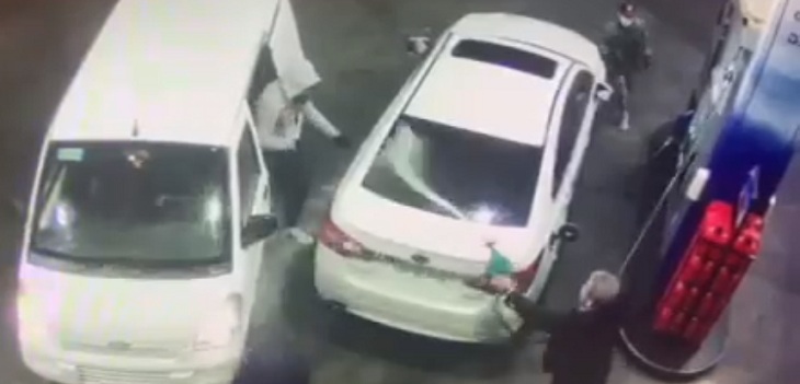 A través de redes sociales se hizo viral un registro que muestra como un hombre se encuentra cargando combustible a su vehículo, cuando tres sujetos se bajan de un furgón blanco, portando armas de fuego.