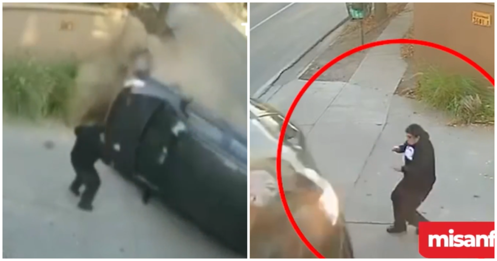 Mientras que Reinoso se mantiene en su posición por algunos segundos, sin embargo, logra reaccionar, salvándose por centímetros de ser aplastado por el vehículo, que era conducido por una mujer.