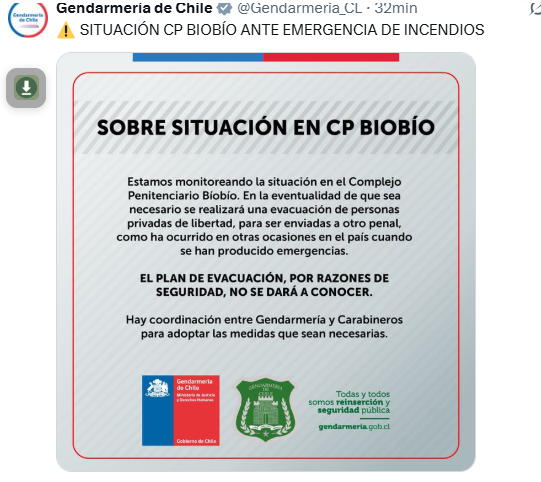 “Respecto a los incendios en Concepción, el Complejo Penitenciario Biobío, por ahora, se encuentra fuera de la zona de riesgo”, precisaron desde la institución.