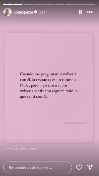 “Cuando me preguntan si volvería con él, la respuesta es un rotundo no… pero yo mataría por volver a sentir con alguien todo lo que sentí con él”, compartió en su Instagram.