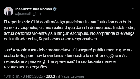 “El reportaje de CHV confirmó algo gravísimo: la manipulación con bots ya no es sospecha, es una realidad que daña la democracia”, sostuvo.