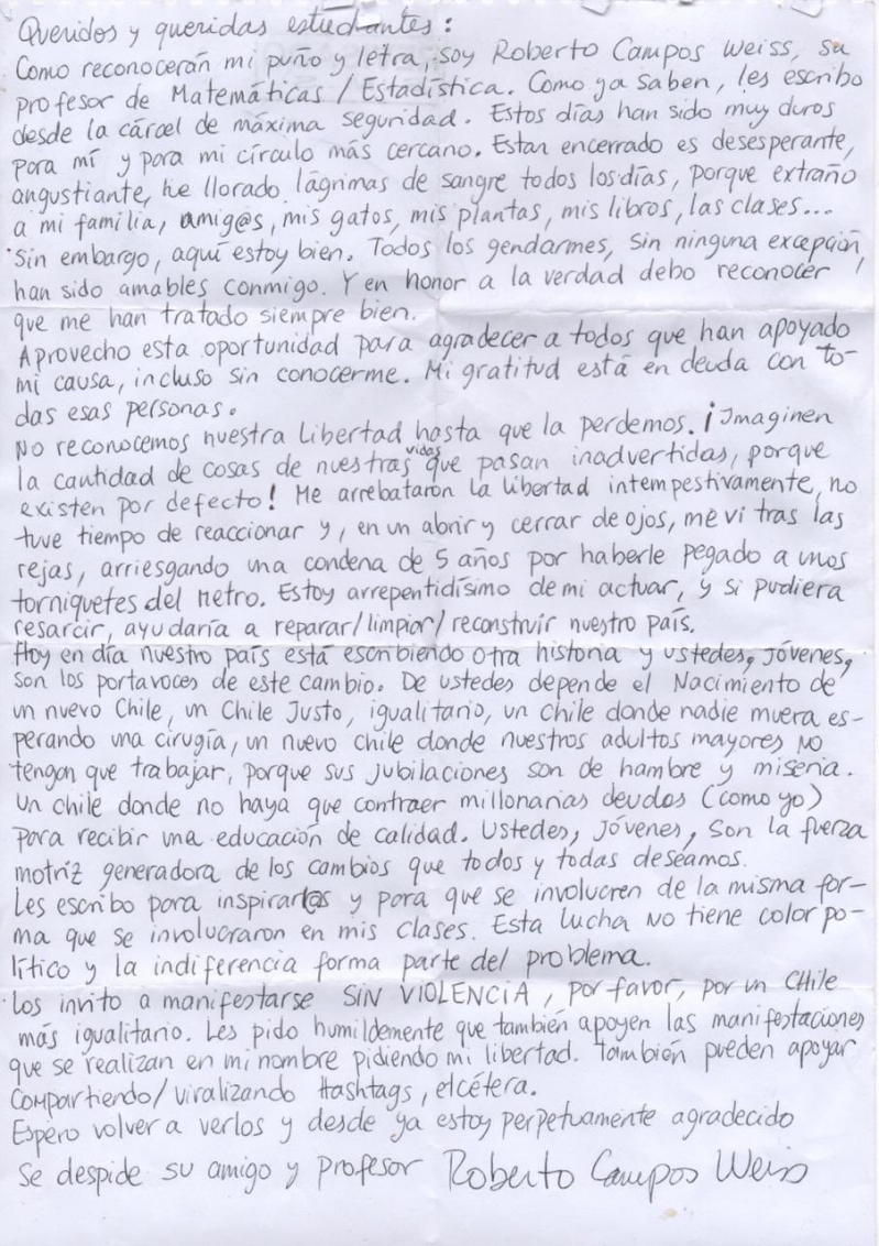 “Me arrebataron la libertad intempestivamente, no tuve tiempo de reaccionar y, en un abrir y cerrar de ojos, me vi tras las rejas, arriesgando una condena de 5 años por haberle pegado a unos torniquetes del Metro. Estoy arrepentido de mi actuar, y si pudiera resarcir, ayudaría a reparar, limpiar, reconstruir nuestro país”, añadió.